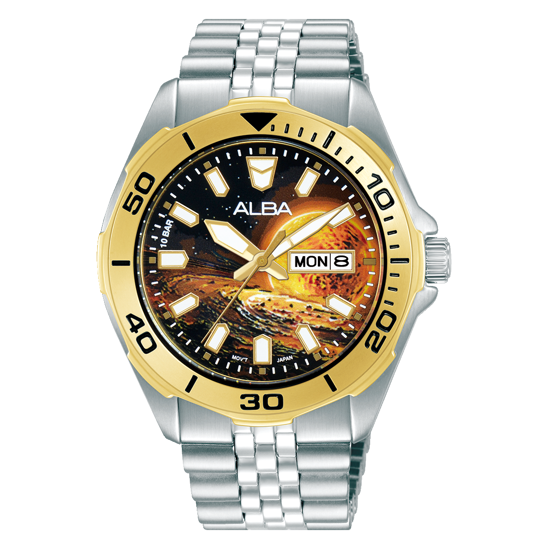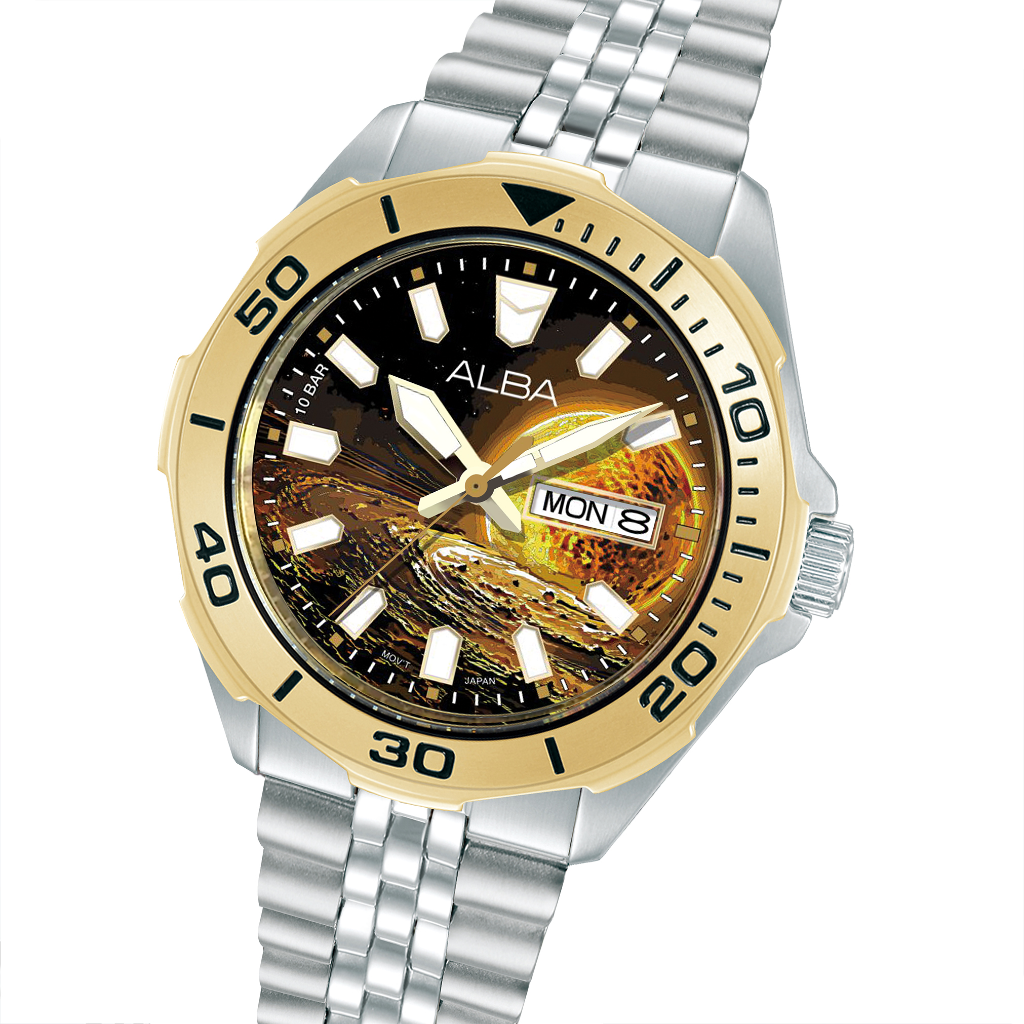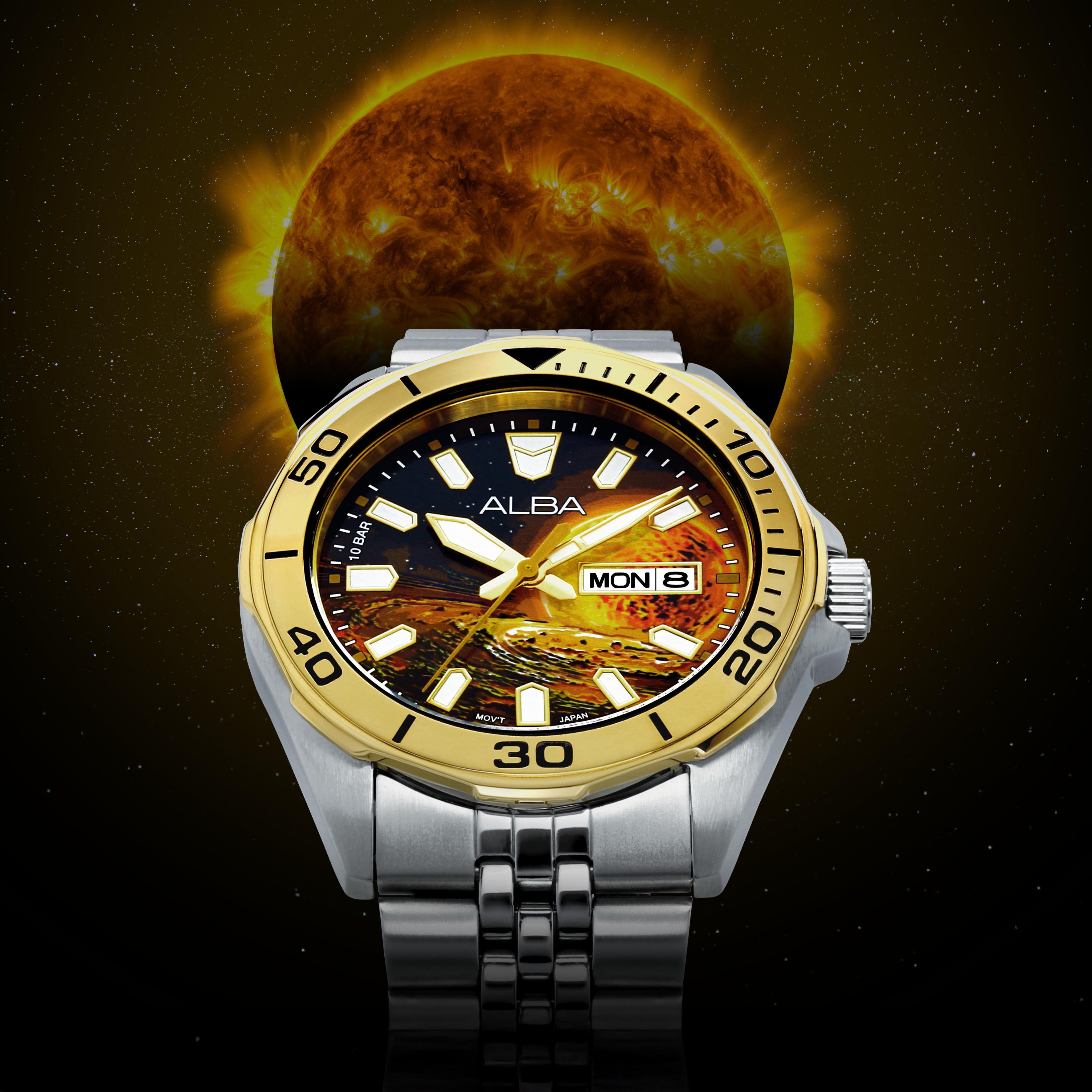In 2024, we proudly unveiled a bold new design concept – “COLOUR OF PLANET.” This debut collection was met with widespread acclaim for its artistry and innovation. Building on the success of this celebrated series, we are delighted to present two exquisite new editions: “ALBA the Sun” and “ALBA the Lunar.” These timepieces embody the elegance and technical sophistication of the original collection, while offering a fresh interpretation of its core values. Each model features a meticulously printed dial, adorned with distinctive Sun and Lunar motifs rendered in vibrant, celestial-inspired hues. Crafted to the highest standards, both watches are powered by the dependable three-hand movement, complete with a day-date window for enhanced functionality. Designed for discerning individuals who seek a harmonious blend of sporty refinement and everyday reliability, these models are housed in a 42mm stainless steel case and paired with a finely finished stainless steel wrap bracelet. The bezel, detailed with ink-filled markers, and the screw-down case back further elevate the timepiece’s luxurious appeal. Whether worn for sport or style, these captivating watches make a statement of sophistication and confidence, ensuring you stand out with timeless elegance.